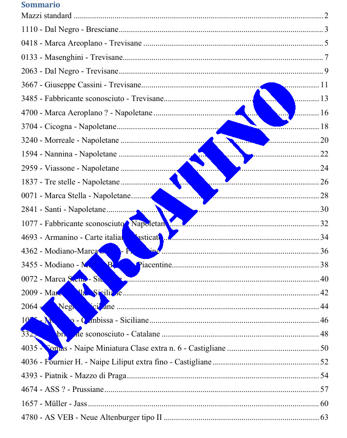 avevo e di quanto sapevo su di loro. Poi per fortuna è apparso il personal computer, senza il quale questo mio lavoro non sarebbe mai stato attuabile. Quasi 5.000 mazzi e oltre 200 volumi non è possibile tenerli "sotto controllo" senza l'informatica. Questo lavoro è nato per poter cercare i mazzi della mia collezione, consultarli senza dover aprire le decine di pesanti scatoloni che li contengono, vedere se un mazzo lo possiedo già o se mi manca, se ci sono altri mazzi simili e così via. Queste note dovevano servire solo a me, ma ho ritenuto opportuno dar loro una forma meno caotica e pubblicarle, sperando che possano servire anche ad altri. Se qualche amico collezionista volesse avere la riproduzione di qualche mazzo più dettagliata, mi scriva e sarò felice di accontentarlo. Quanto trovate in questo lavoro è frutto dello studio dei mazzi della mia collezione, della lettura di volumi e pubblicazioni sull'argomento, il tutto unito a mie considerazioni e deduzioni, a scambi di idee con altri collezionisti e così via. Non ho mai avuto una passione così a lungo; altre mie collezioni sono durate molto meno, sono sempre stato un incostante con troppi interessi. La collezione è nata contemporaneamente al mio matrimonio; i primi mazzi li ho comprati in viaggio di nozze. Due "interessi" durati così tanto. Sono stato fortunato. Ora mi pongo un problema. Vista la mia età fra qualche anno me ne andrò, dove non lo so, ma sarà un saluto definitivo a tutti. E della mia collezione che ne sarà? Non voglio che le mie carte finiscano in discarica o su un mercatino dove la gente si chiederà cosa sono quegli strani rettangoli di cartone che nessuno usa più, salvo qualche anziano, le signore del burraco o i "fighetti che giocano a bridge", come ci chiamavano quando ero appassionato a questo gioco. Se qualcuno è interessato a questi mazzi o ai volumi citati nella bibliografia me lo faccia sapere. Sarebbe bellissimo se potessero fare la gioia di qualcun altro. |