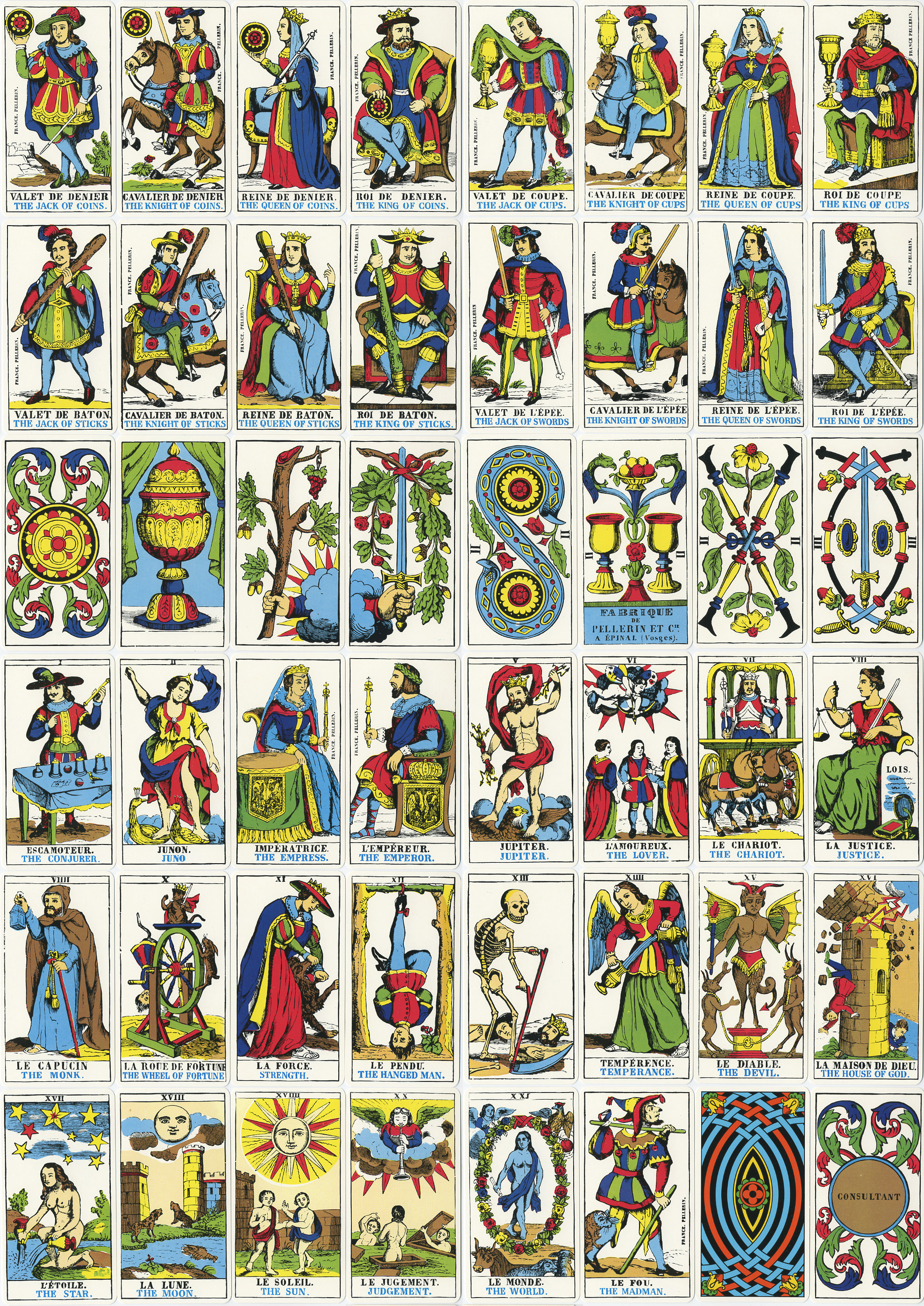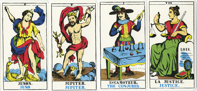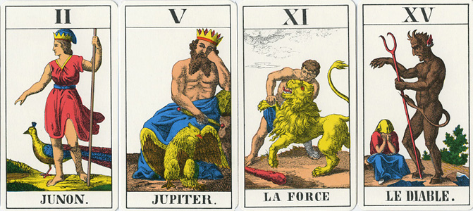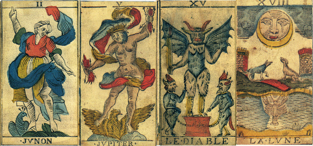 2 Juno/Giunone 5 Jupiter/Giove 1 Bateleur 15 Diavolo con corpo ricoperto di peli 18 Cani che abbaiano alla luna, luna di fronte |