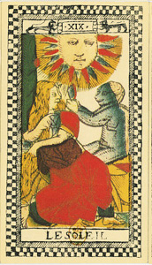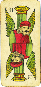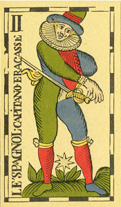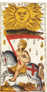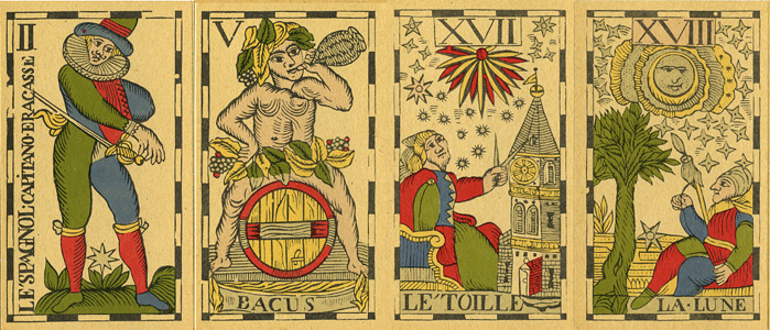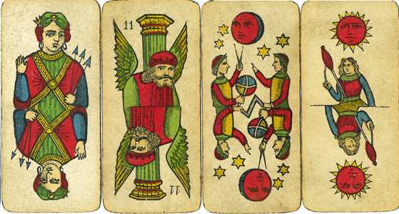 | II Capitan Fracasse | XIX Sole Uomo a cavallo con bandiera | XIX Sole Donna con scimmia che regge uno specchio | XI Eremita con ali e colonna alle spalle |