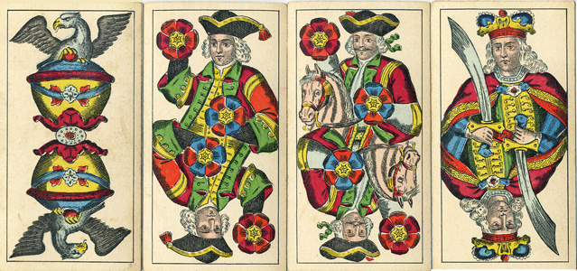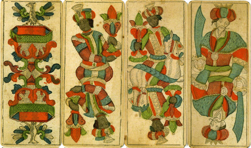 spade con turbante Fante coppe con tricorno e coppa coperta Cavallo e re denari con un solo seme |