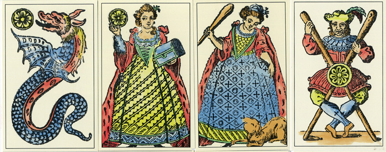 - Donne con corona Assi con draghi/serpenti Due bastoni incrociati con uomo che regge semi |