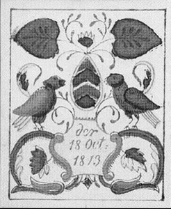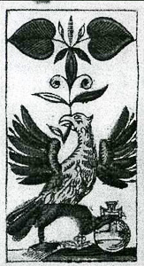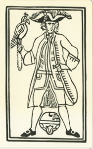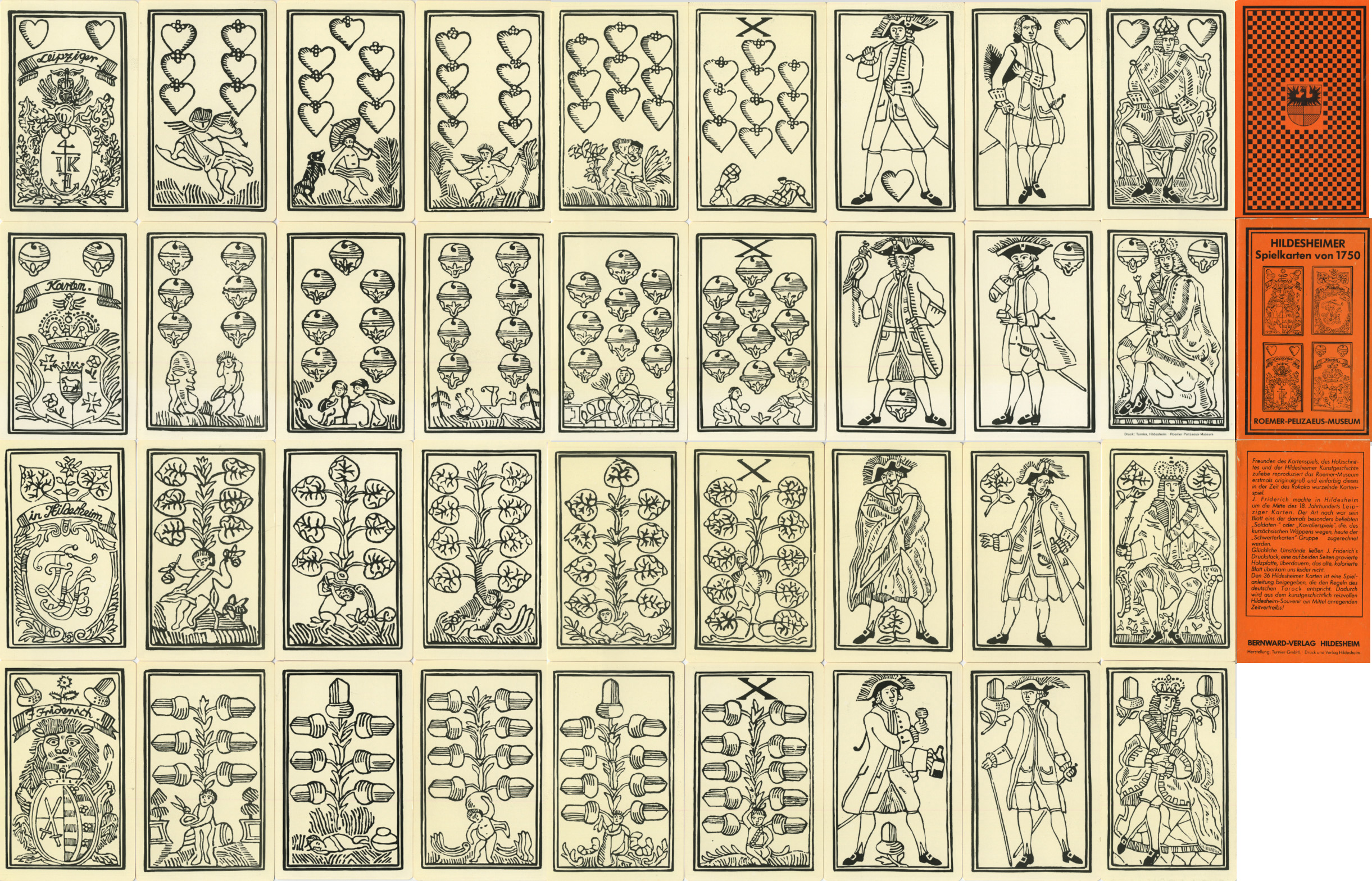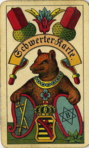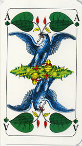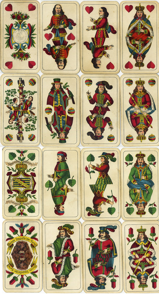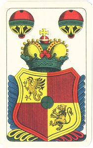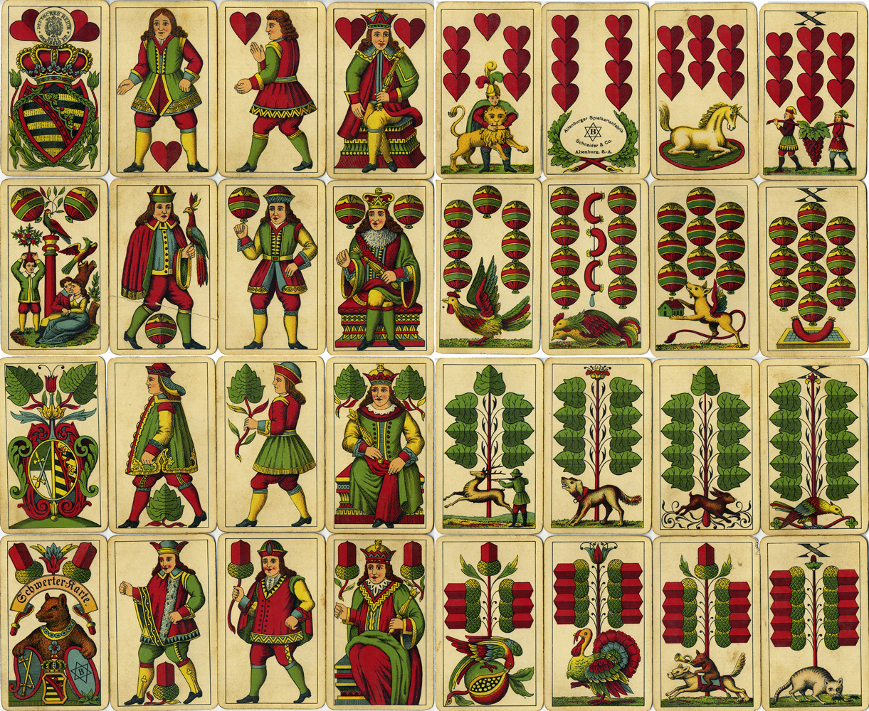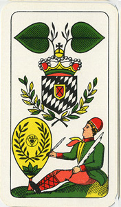 |  figure speculari |  | Daus ghiande con leone Unter campanelli con uccello sulla mano Unter foglie con berretta floscia, senza bastone Ober foglie con 2 piume sul cappello |